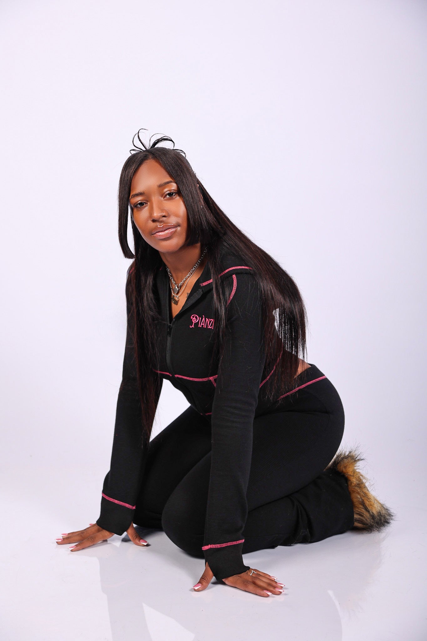 Black with hot pink stitching details.